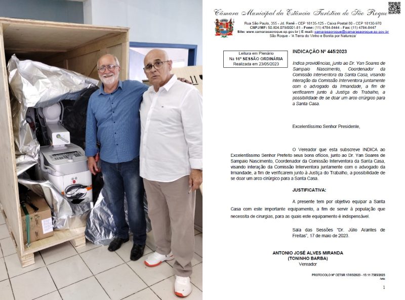 Tal melhoramento foi um pedido do Parlamentar, através da Indicação nº 445/2023, protocolada no Legislativo em maio deste ano. “Na época, pedi a Comissão Interventora da Santa Casa e o jurídico do hospital para verificarem junto à Justiça do Trabalho, a possibilidade de se doar um arco cirúrgico. Unimos forças e após anos de espera, o centro cirúrgico receberá este importante equipamento que em muito contribuirá para a realização de cirurgias de traumatologia e fraturas de média complexidade, cirurgias vasculares e do aparelho digestivo, enfim, para cirurgias gerais”, diz o Vereador.